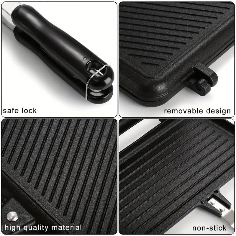 Discover the ultimate kitchen companion with the 1pc Non-stick Double-sided Frying Pan Sandwich with Handle. Designed for efficiency and convenience, this innovative pan features a double-sided cooking surface that allows you to prepare perfectly toasted sandwiches, pancakes, and more with ease. Its high-quality non-stick coating ensures food releases effortlessly while reducing the need for excessive oil, promoting healthier cooking. The ergonomic handle stays cool to the touch, enhancing safety and comfort during use. Crafted for even heat distribution, it delivers consistent cooking results every time. Ideal for busy mornings or quick snacks, this pan combines functionality with durability to elevate your culinary experience.