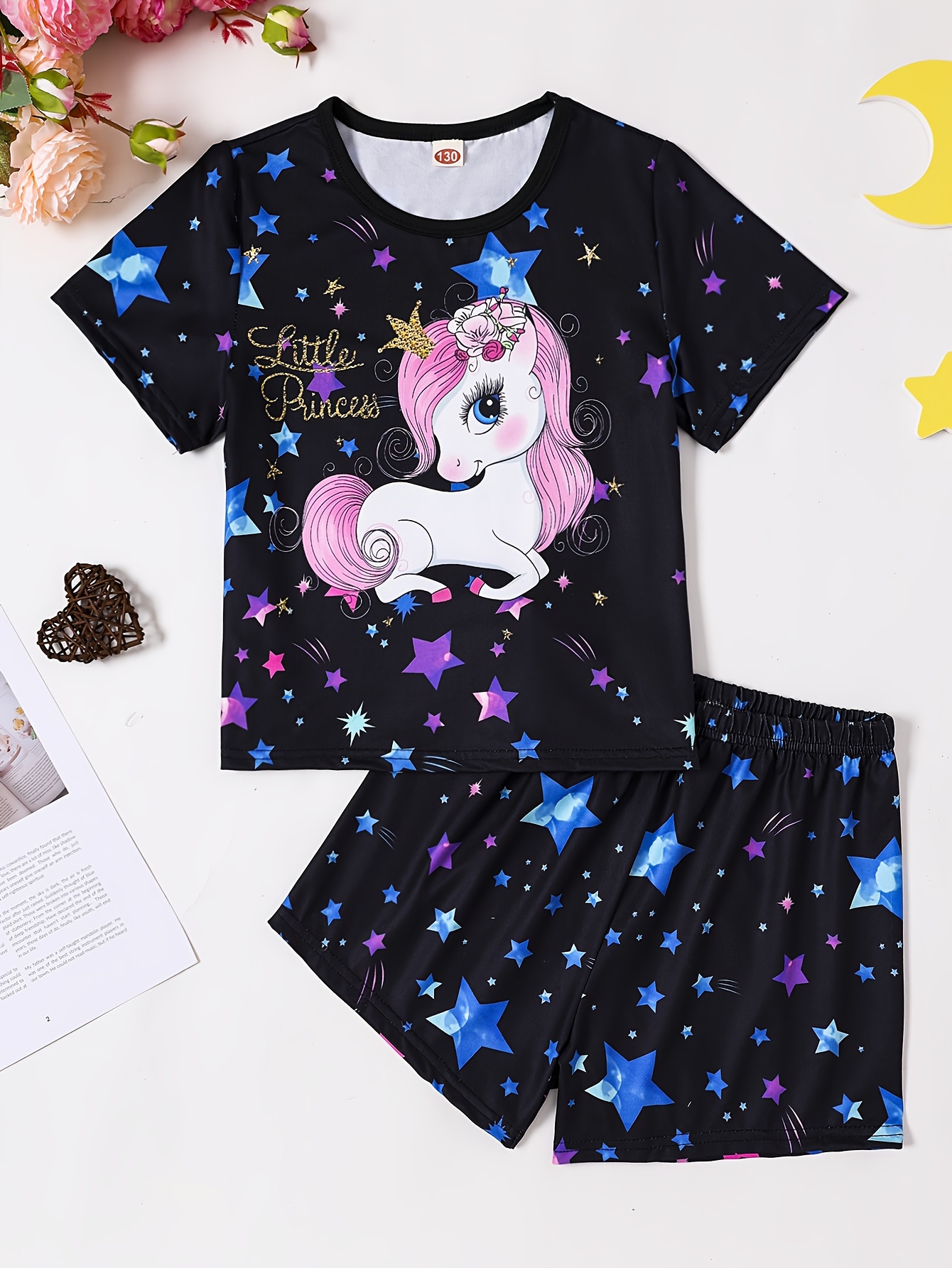 Crafted for young dreamers, this enchanting two-piece pajama set combines whimsical design with everyday comfort. Each set features a luminous unicorn motif paired with a starry night pattern, rendered in soothing pastel pink tones that appeal to children's imagination while maintaining a sophisticated aesthetic. The short-sleeve round neck design ensures unrestricted movement during sleep, while the lightweight fabric provides optimal breathability for warm summer nights. Constructed from soft, durable materials, these princess-inspired pajamas withstand frequent wear and machine washing without compromising quality or color vibrancy. The sparkling star embellishments add a touch of magic to bedtime routines, making sleep time more appealing for young wearers. Ideal for everyday loungewear or special occasions, this set delivers both style and practicality for parents seeking reliable sleepwear solutions.