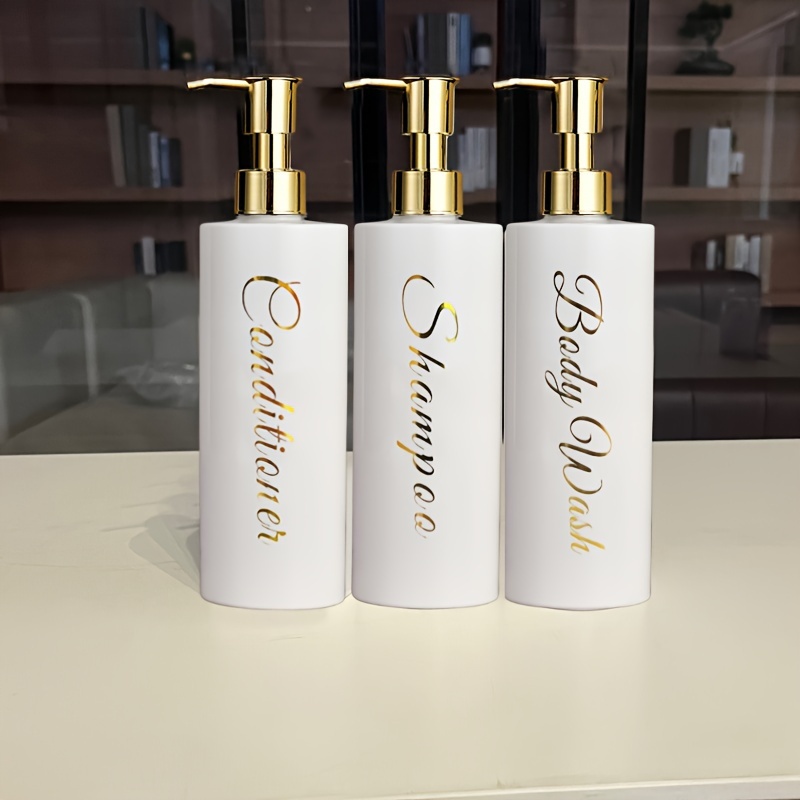Transform your bathroom or kitchen with this sophisticated 3-piece dispenser set, engineered for both functionality and aesthetic appeal. Each 500ml container features premium plastic construction designed to withstand daily use while maintaining its elegant white finish. The refined golden labels add a touch of luxury, allowing you to organize and identify contents at a glance. These versatile dispensers work seamlessly with soaps, lotions, shampoos, and other liquid products, making them an essential addition to any modern home. The generous 500ml capacity reduces frequent refilling, while the sleek design complements contemporary and classic interiors alike. Durable, practical, and visually striking—this set elevates your space with understated sophistication.