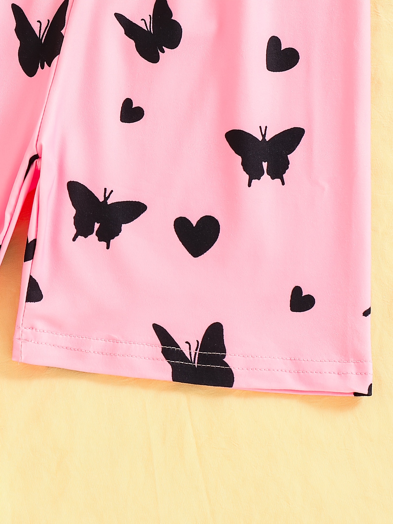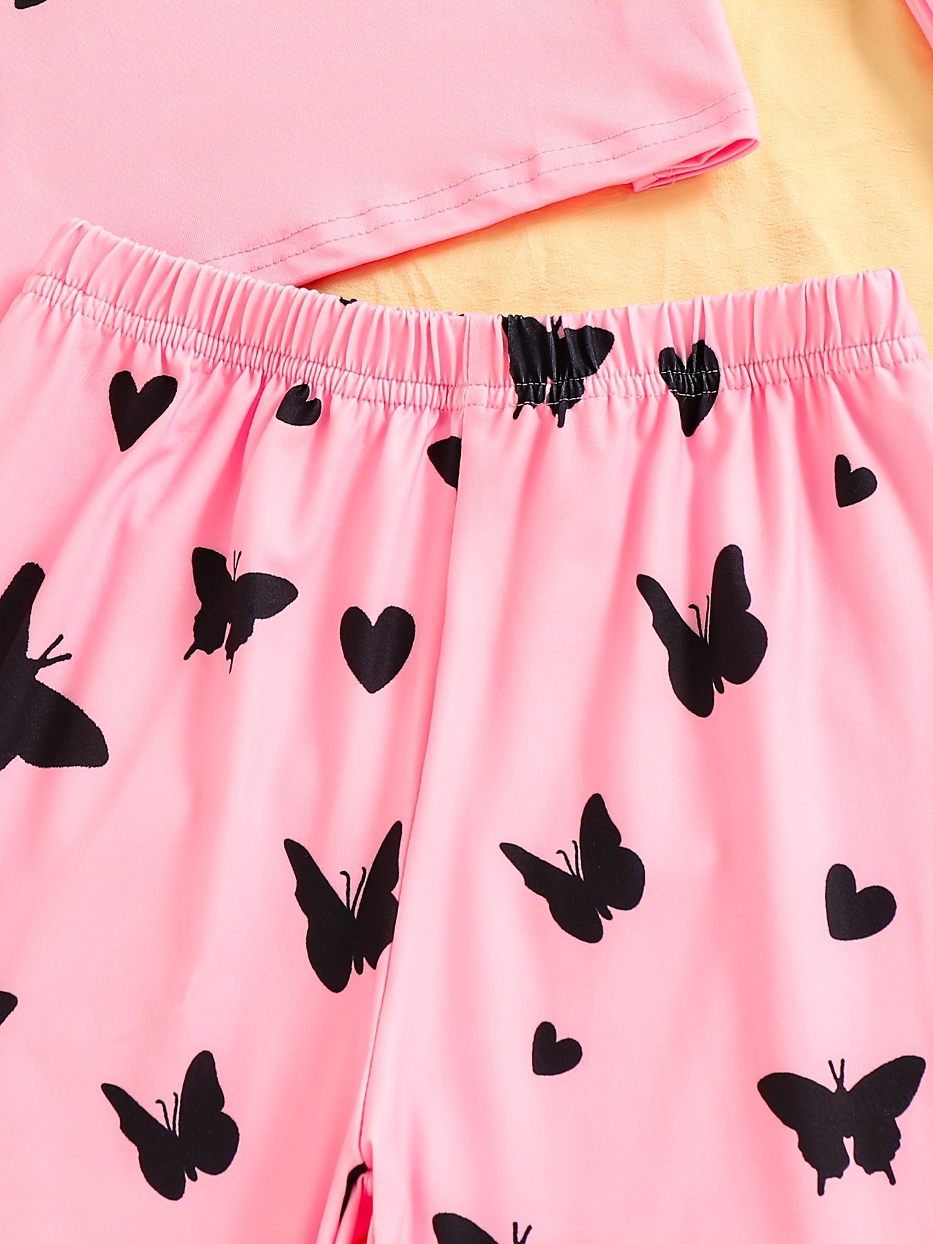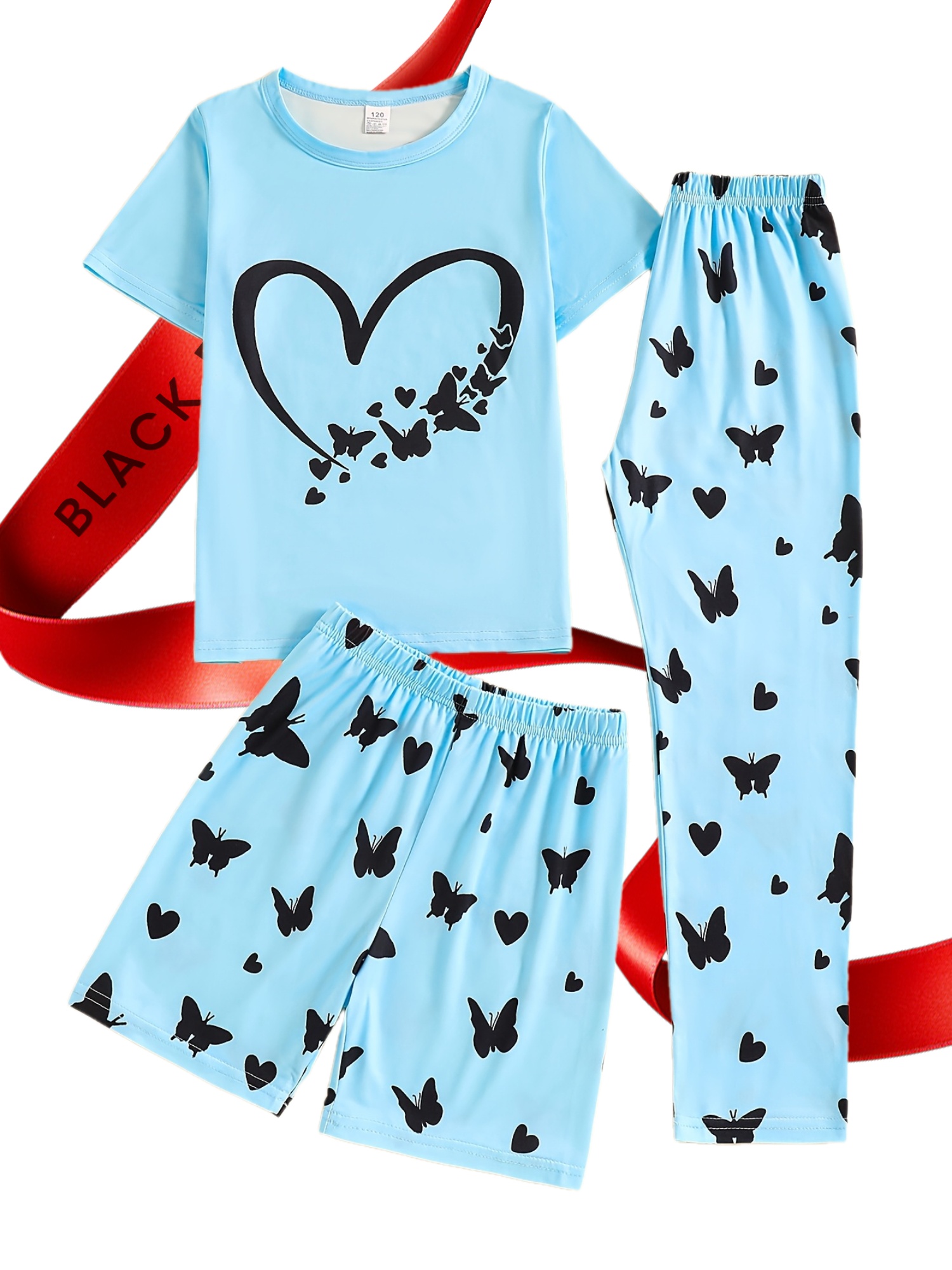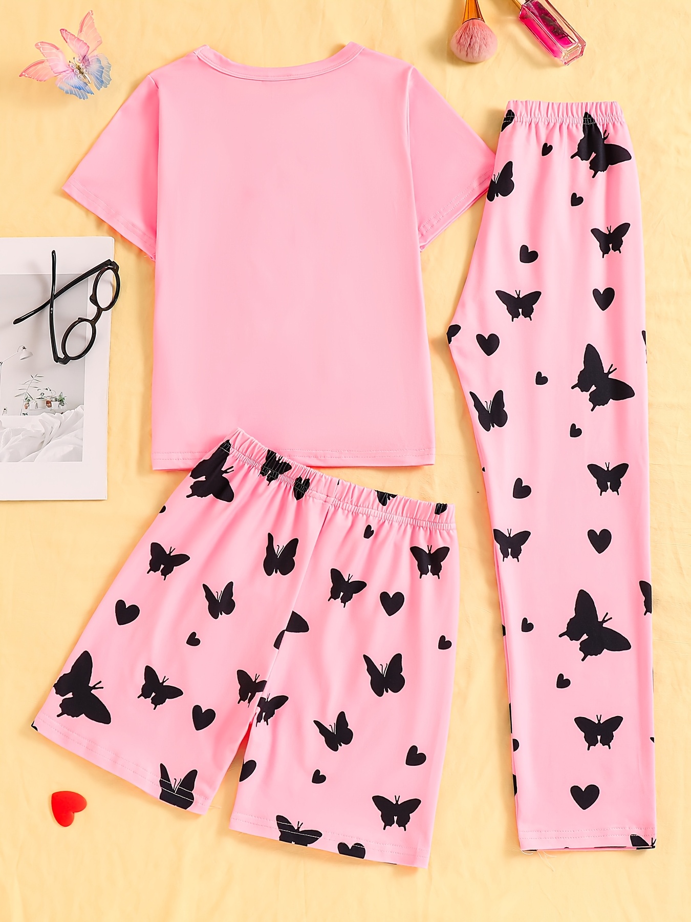 # 3pcs Girls' Pajama Set with Heart and Butterfly Print This comprehensive three-piece pajama collection combines comfort with playful design, featuring charming heart and butterfly motifs that appeal to young sleepers. Each set includes coordinated pieces crafted from soft, breathable fabric that supports healthy sleep patterns and all-night comfort. The thoughtfully designed ensemble provides versatility—mix and match components for multiple outfit combinations throughout the week. Quality stitching and reinforced seams ensure durability through frequent washing and wear, making this set a practical investment for growing children. The heart and butterfly prints add personality to bedtime routines while the coordinated pieces simplify getting dressed. Ideal for everyday wear or as a gift, this pajama set balances style with the functional comfort that children need for restorative sleep.