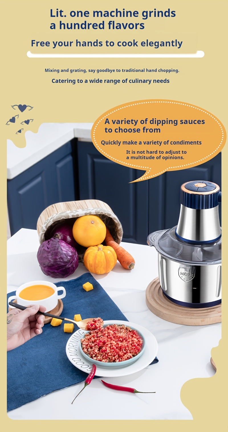 Unlock the full potential of your kitchen with the 5L Multifunctional Electric Chopper Food Processor. Crafted with durable stainless steel, this robust 5-liter capacity appliance allows you to process large quantities effortlessly. Featuring five adjustable speed settings, it offers precise control for chopping, blending, grinding, and pureeing a wide variety of ingredients. Its multifunctional design streamlines meal preparation, saving you time and effort whether you're working with vegetables, nuts, or meats. The electric motor delivers consistent power, ensuring uniform results every time. Designed for easy cleaning and reliable performance, this versatile food processor is an essential tool for expert cooks seeking efficiency and quality.