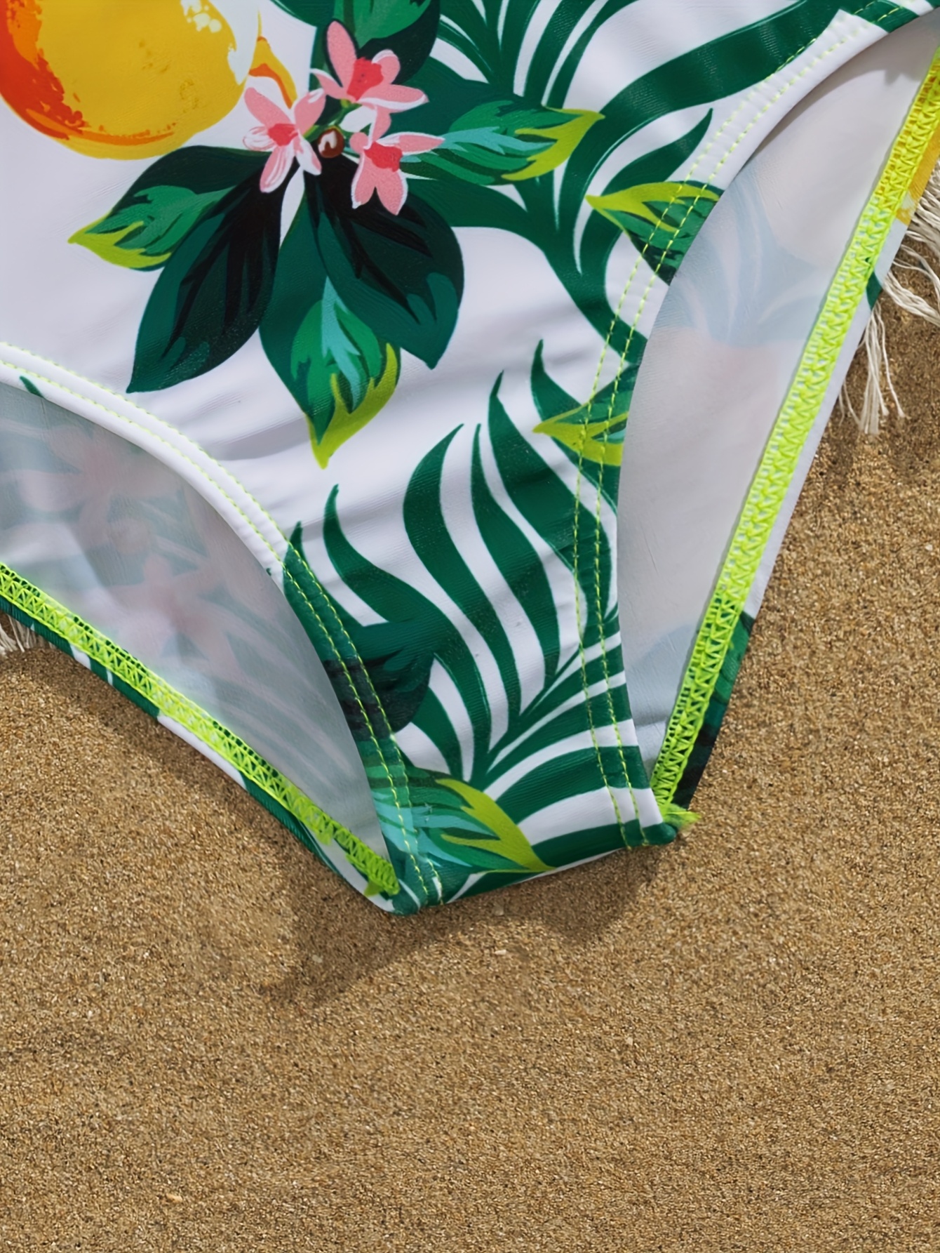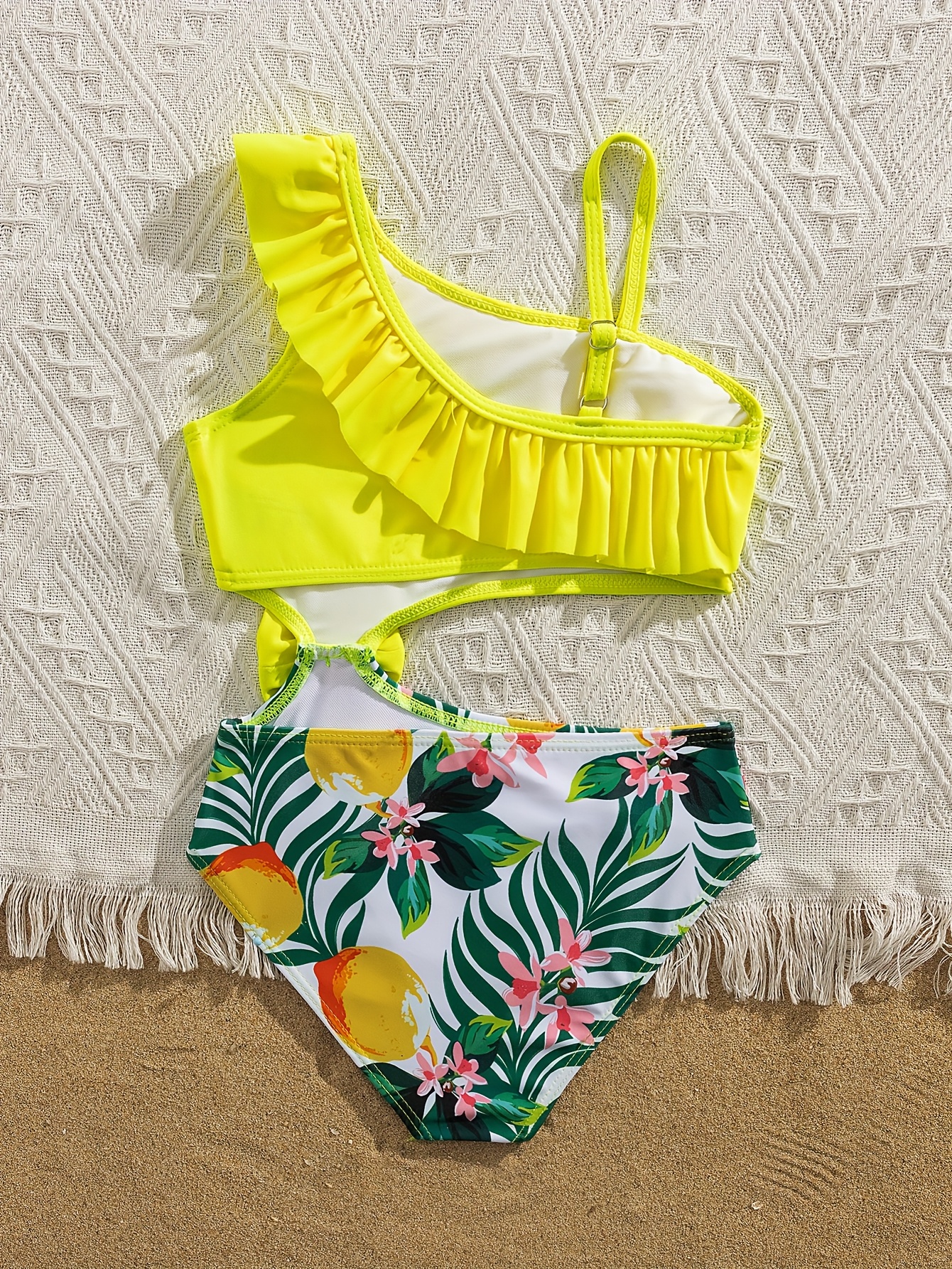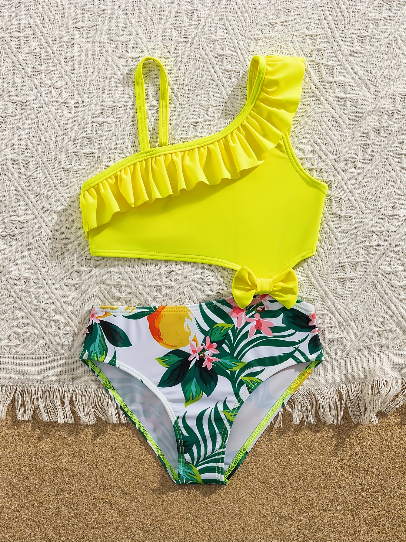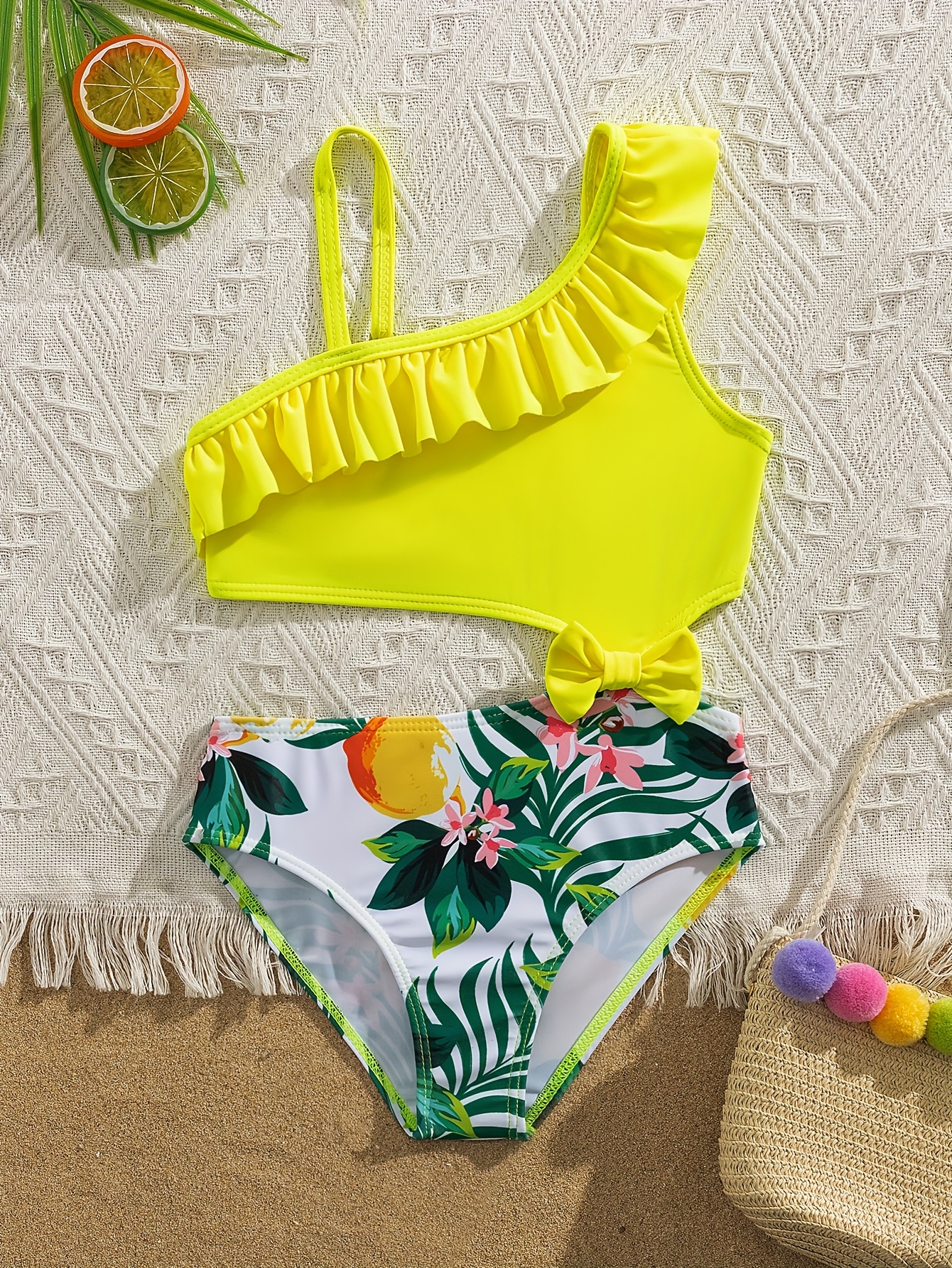 Cute Solid Color Lemon Print Girls' Bow Asymmetrical Shoulder Ruffle Detail One-Piece Swimsuit