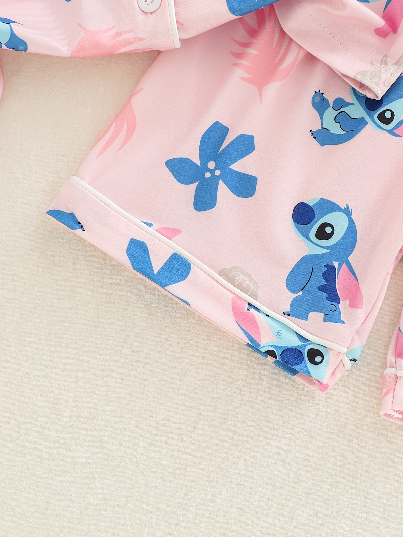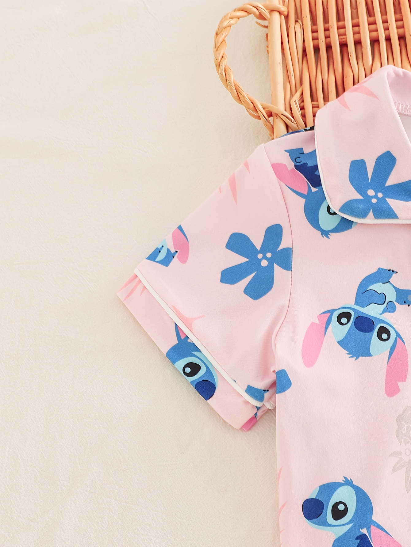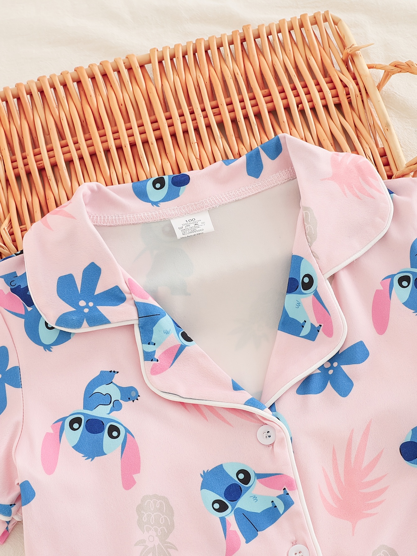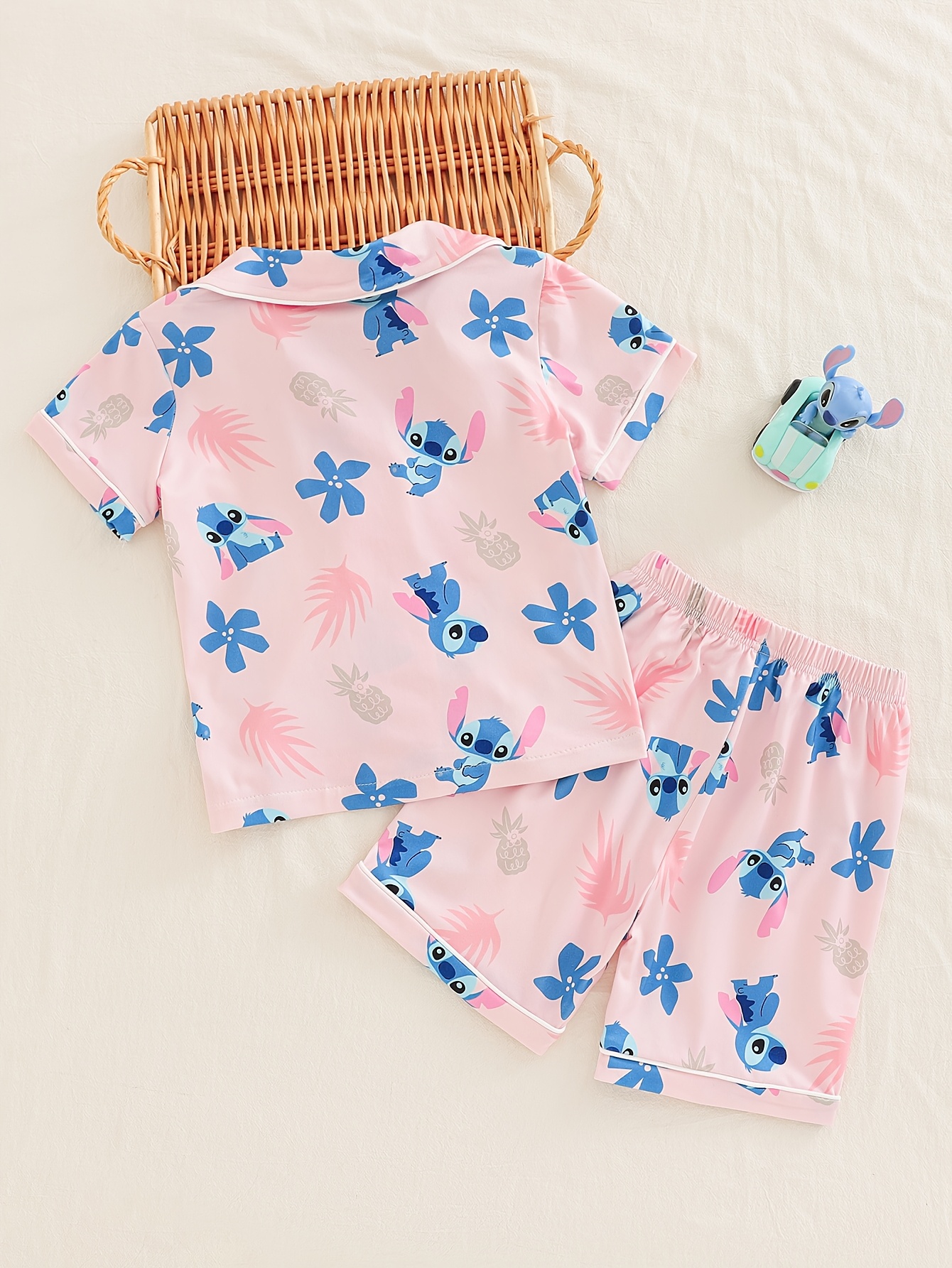 Crafted for young Disney enthusiasts, this Stitch-themed pajama set combines comfort with practical design for everyday wear. The ensemble features a coordinated top and shorts constructed from flame-retardant polyester, meeting essential safety standards for children's sleepwear. The vibrant Stitch print captures the playful spirit of the beloved character, making bedtime and casual indoor activities more enjoyable. The breathable fabric ensures comfort during warmer months, while the relaxed fit accommodates natural movement for active play and restful sleep. Ideal for spring and summer seasons, this two-piece set serves as reliable home wear for sports activities, lounging, or daily casual use. The durable polyester construction withstands regular washing, maintaining color vibrancy and shape through repeated wear.