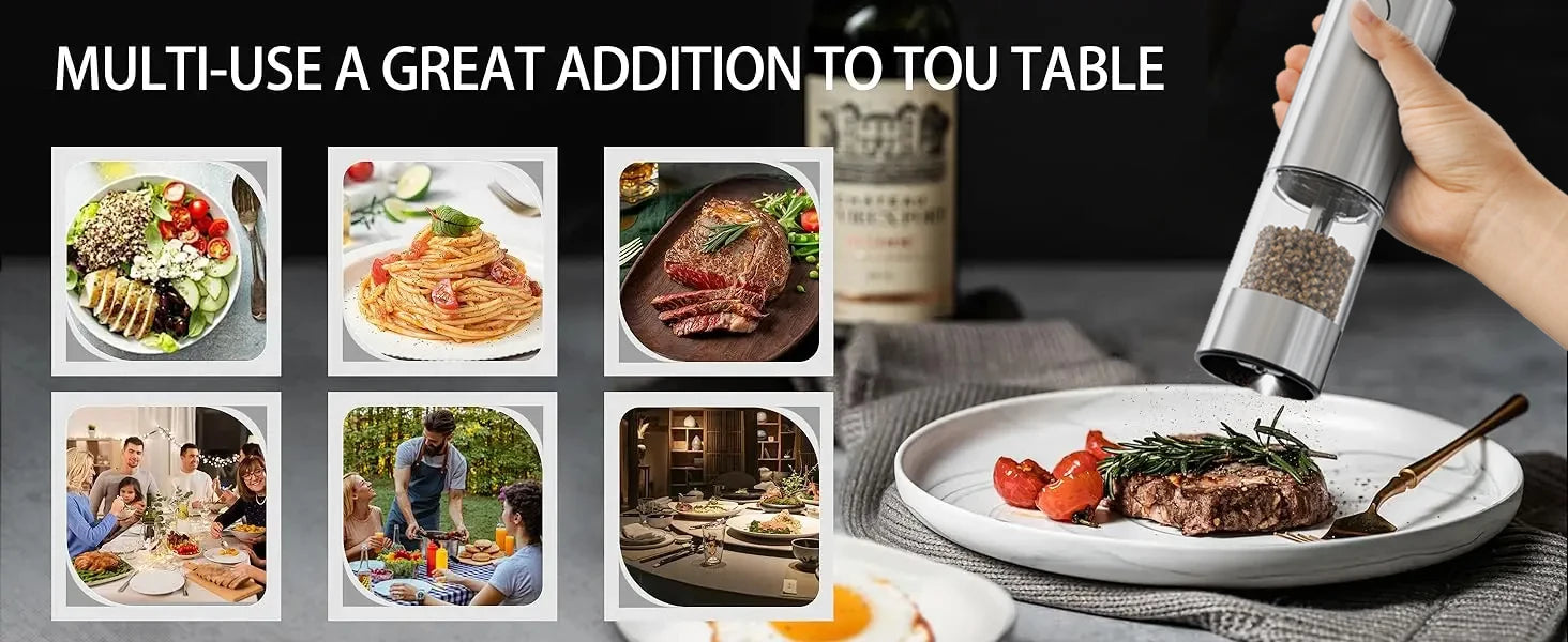 # Electric Pepper Grinder Stainless Steel Salt & Pepper Engineered for precision and durability, this electric pepper grinder combines professional-grade functionality with everyday convenience. The robust stainless steel construction resists corrosion and maintains its refined appearance through years of use. Featuring adjustable grinding settings, you can achieve anything from coarse cracks to fine powder, giving you complete control over texture and intensity for any culinary application. The ergonomic design fits comfortably in your hand, while the efficient motor delivers consistent results with minimal effort. Ideal for both salt and pepper, this grinder eliminates the tedium of manual grinding while ensuring uniform particle size that enhances flavor distribution in your dishes. Battery-powered operation means no cords cluttering your kitchen counter, and the transparent chamber lets you monitor supply levels at a glance. A practical addition to any kitchen that values both performance and aesthetics.