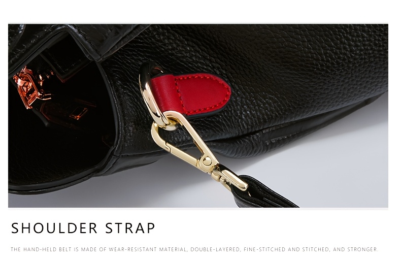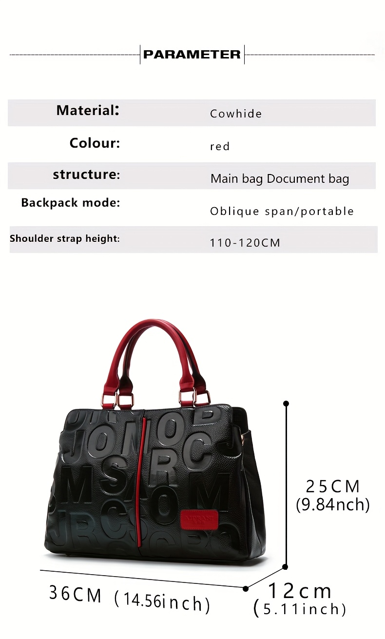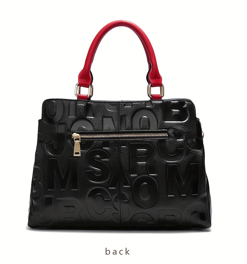 Crafted from genuine leather, this women's shoulder handbag combines durability with style. Featuring a striking black body accented with red details and subtle JOEJOE lettering, it offers a sophisticated look suitable for work, casual outings, or formal events. The spacious interior, lined with polyester, includes a secure zipper closure to keep essentials organized and protected. Perfectly balancing elegance and practicality, this handbag is a versatile addition to any wardrobe.