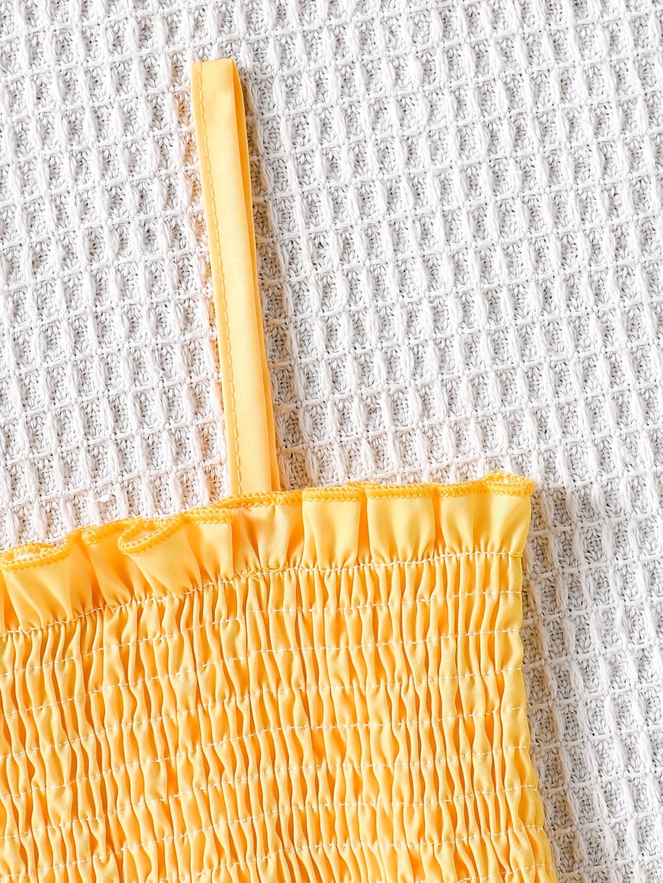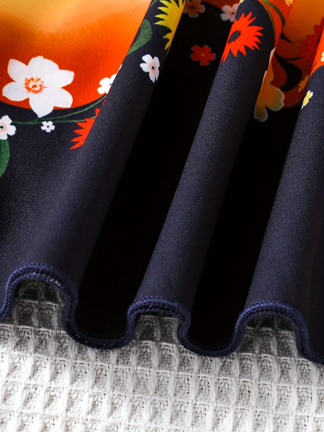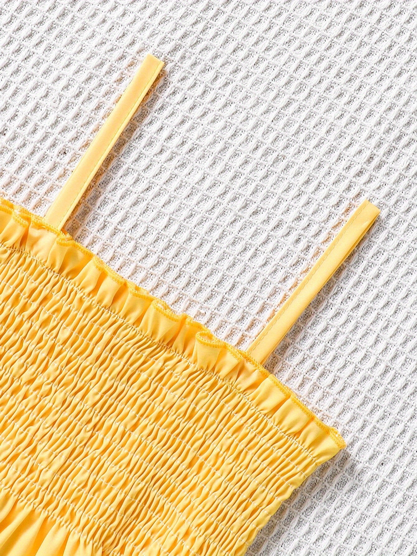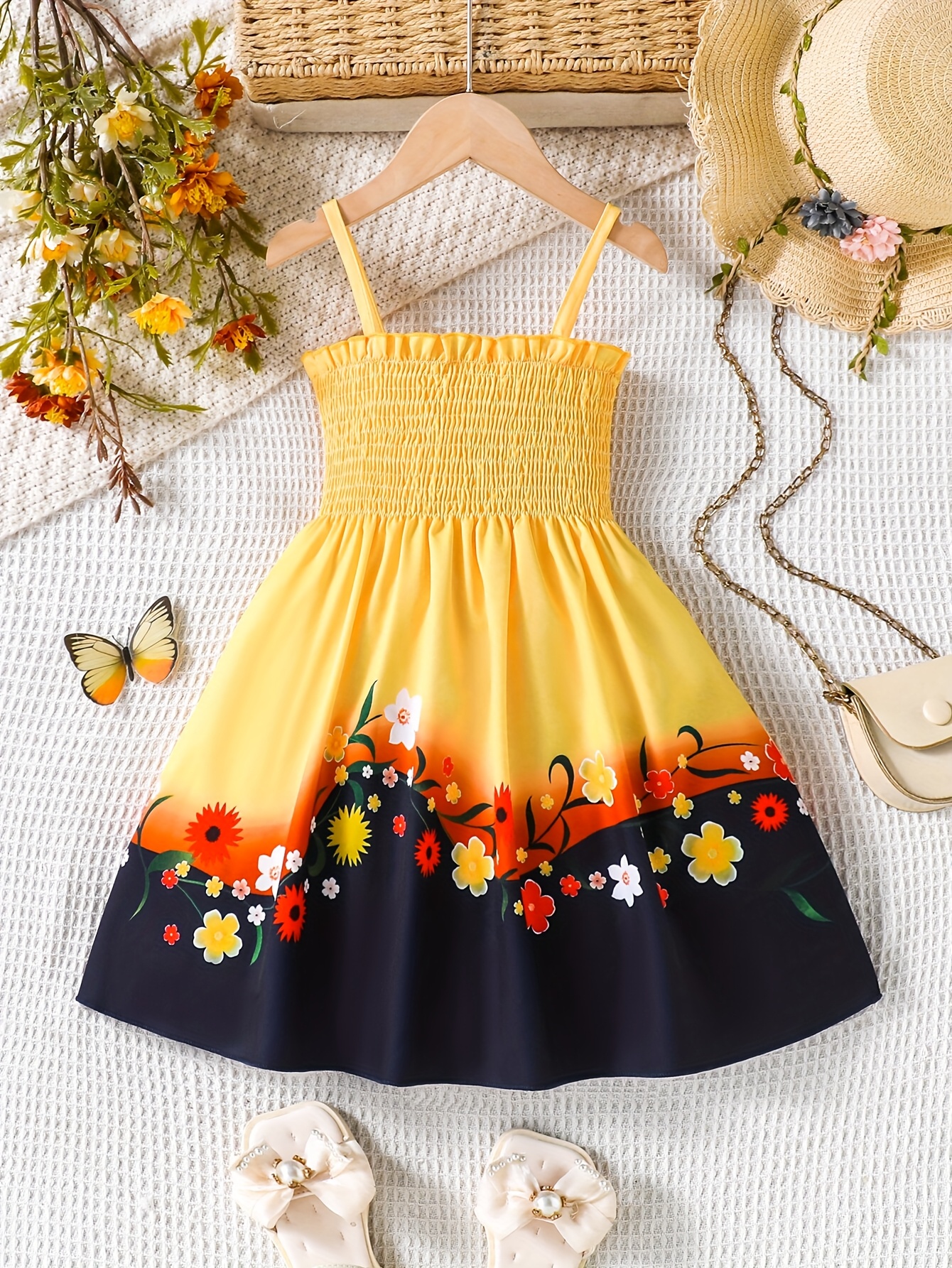 This girls' dress features a charming floral pattern complemented by delicate ruffled detailing along the spaghetti straps, adding a touch of elegance and playfulness. Crafted for comfort and style, its suspender design ensures a secure fit while allowing freedom of movement. Ideal for casual outings or special occasions, this dress balances timeless design with youthful appeal.