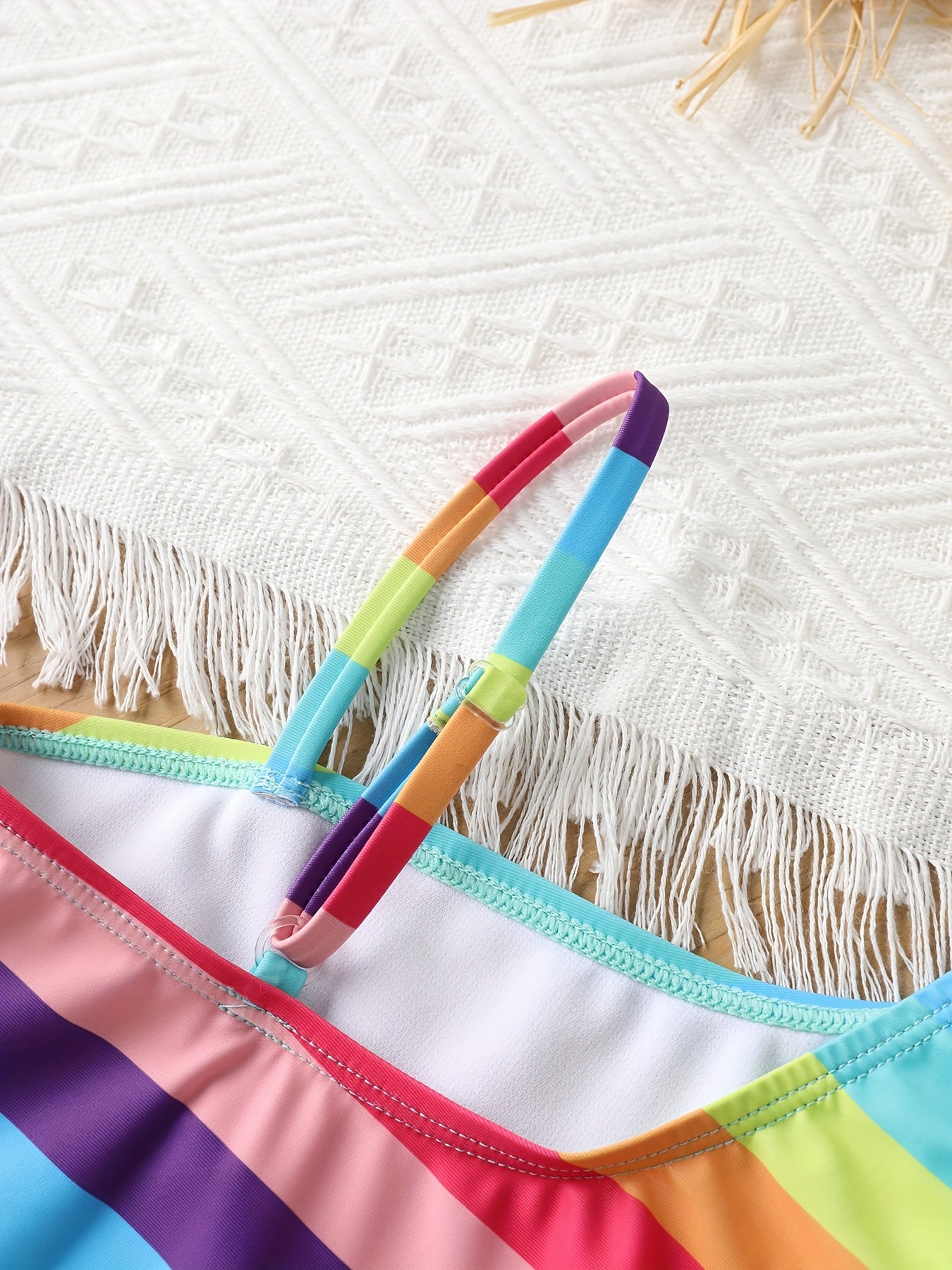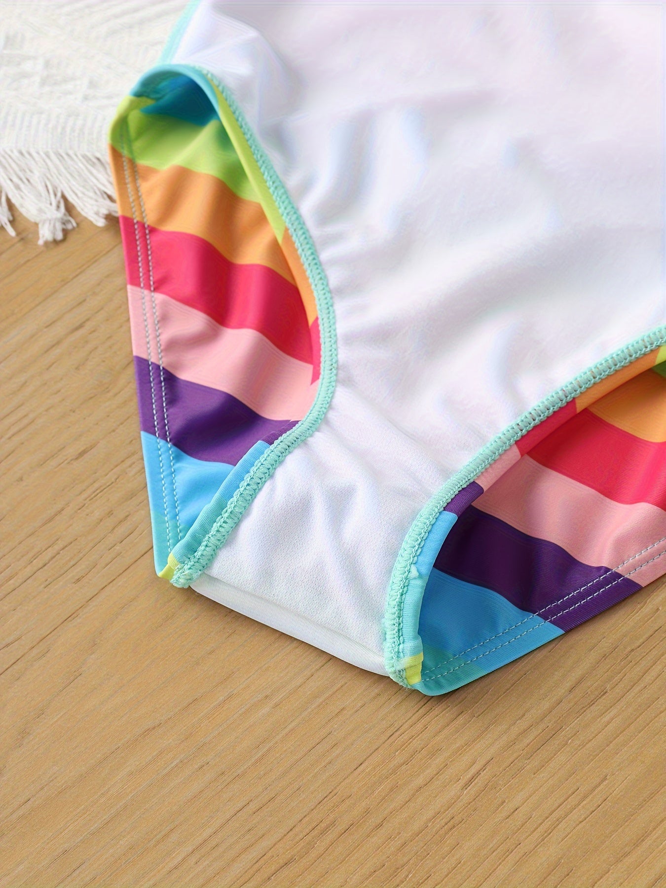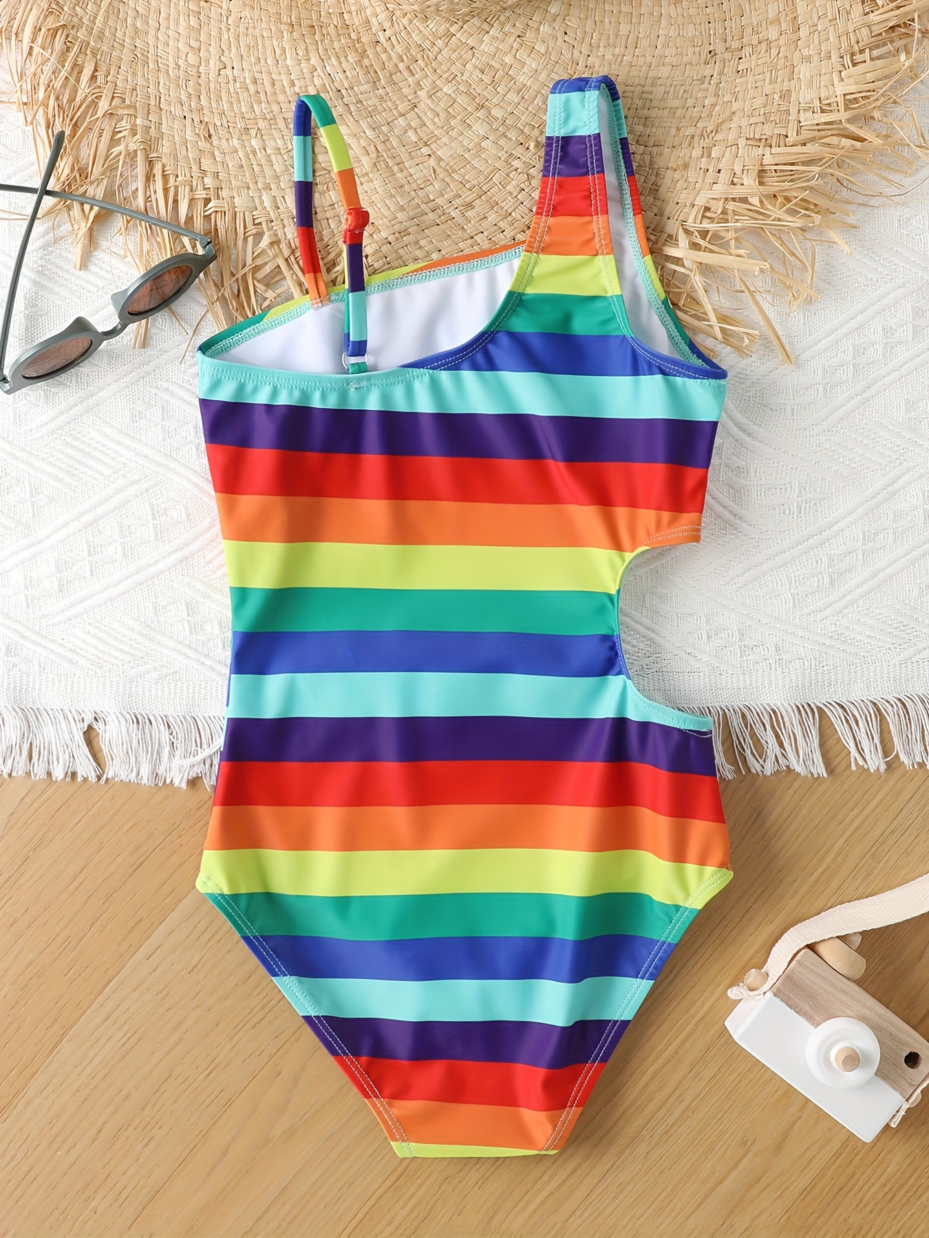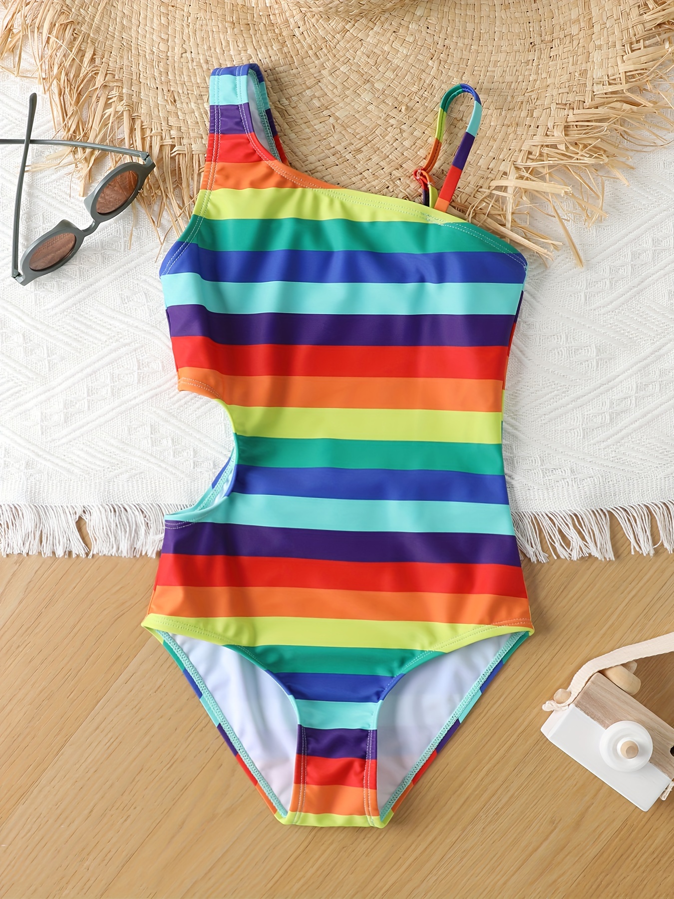Girls' Quick-Dry One-Piece Swimsuit in vibrant multi-color stripes featuring turquoise, pink, yellow, green, and orange. This slim-fit bodysuit combines style with performance, designed with an asymmetric neckline that adds contemporary flair. The high-elastic construction ensures a secure, comfortable fit for active swimmers and water enthusiasts. Engineered with quick-dry technology, this swimwear transitions seamlessly from pool to beach to casual wear throughout the year. The durable fabric withstands chlorine and saltwater exposure while maintaining color vibrancy. Perfect for competitive swimmers, recreational pool days, beach outings, and water-based sports activities. The machine-washable design simplifies care and maintenance, extending the garment's lifespan. The strategic color blocking creates a flattering silhouette while the high-performance elastic provides freedom of movement. Ideal for girls seeking reliable, fashionable swimwear that performs as well as it looks.