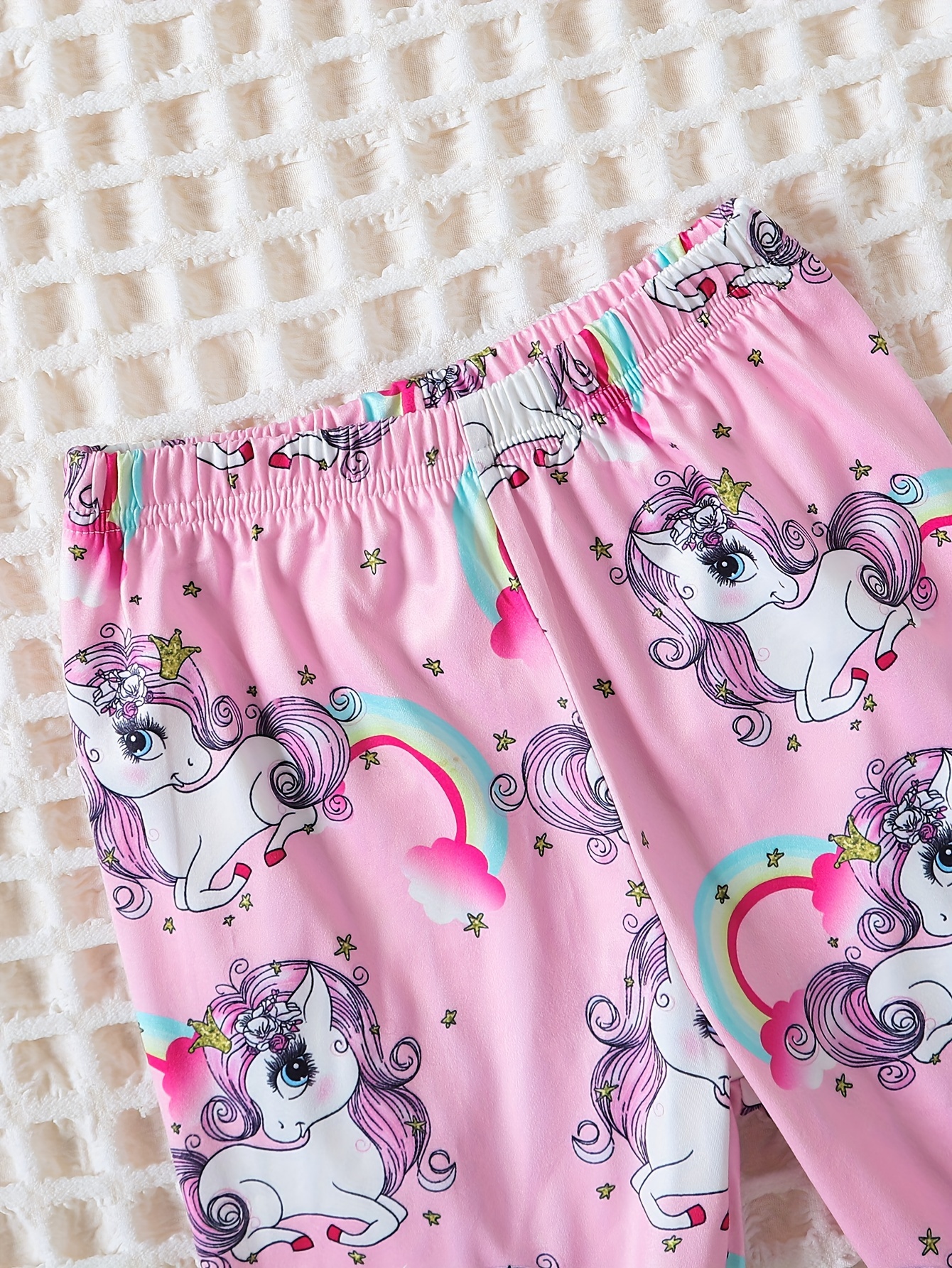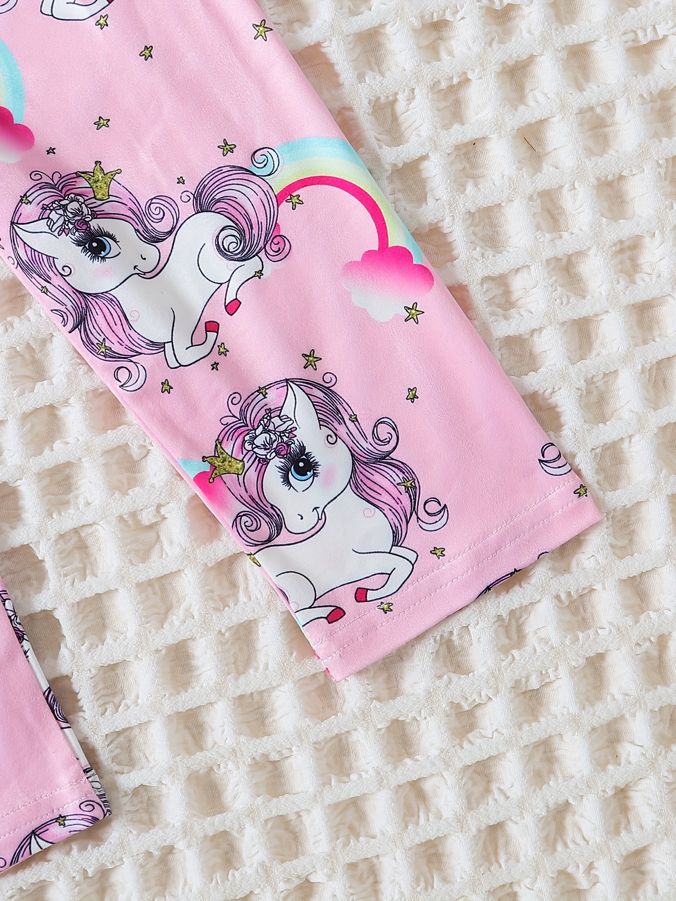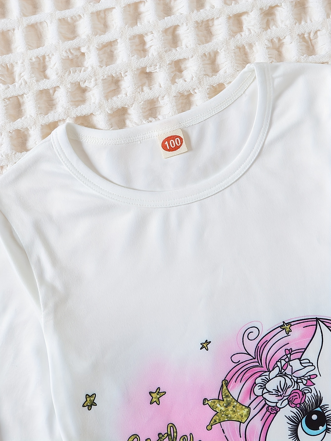 Girls Spring and Autumn Unicorn Print Pants Suit This charming two-piece ensemble combines playful design with practical comfort for young girls. The soft, breathable fabric ensures all-day wearability during transitional seasons, while the classic round neckline and long sleeves provide modest coverage. The whimsical unicorn print appeals to children's imaginations, making it an engaging choice for everyday wear, school outings, or casual playdates. The relaxed fit accommodates natural movement and growth, essential for active children. Quality stitching and durable materials withstand frequent washing and wear. Available in versatile sizing to suit various age groups and body types. Perfect for parents seeking stylish yet practical clothing that balances aesthetic appeal with functional comfort for their daughters.