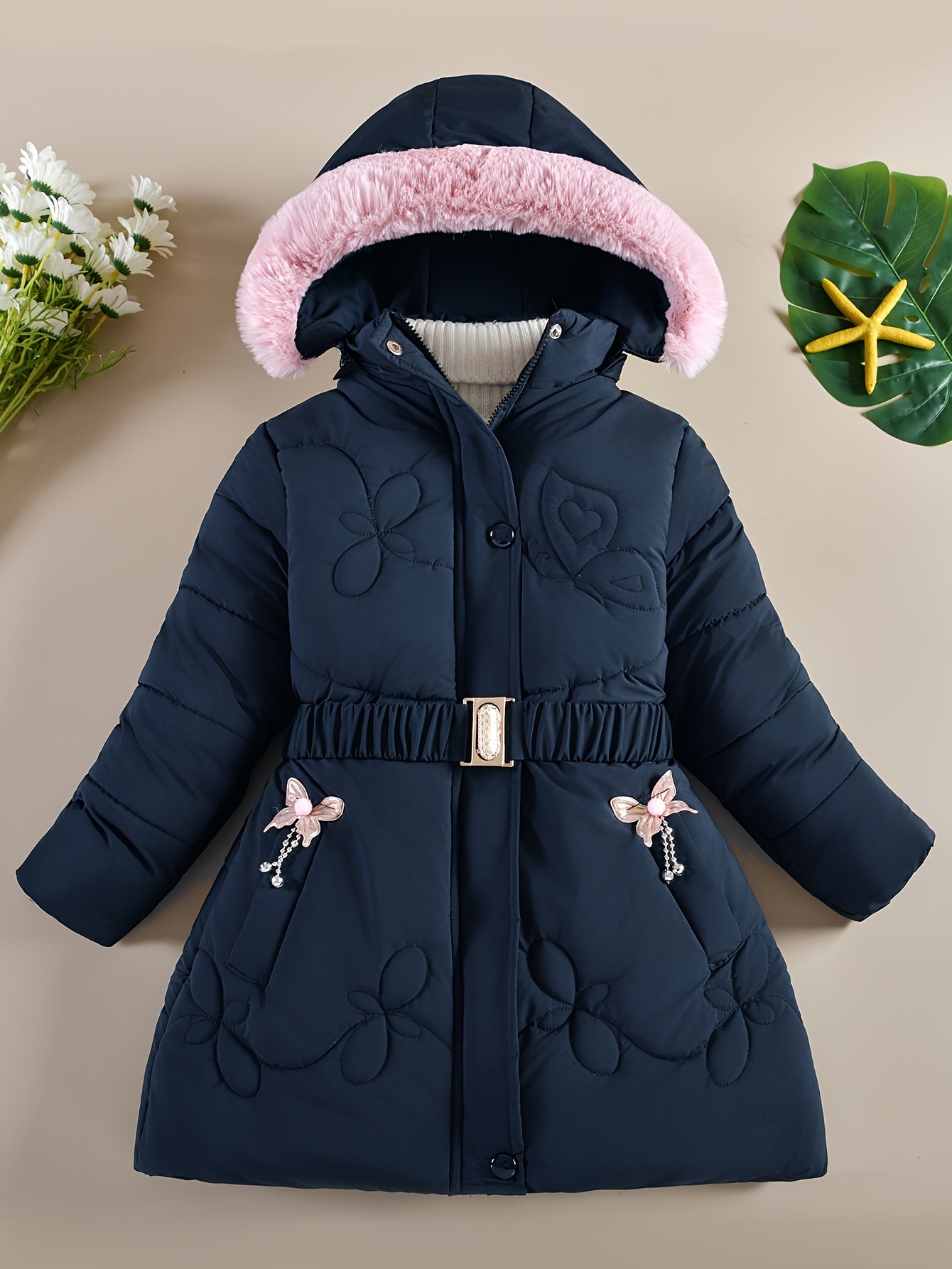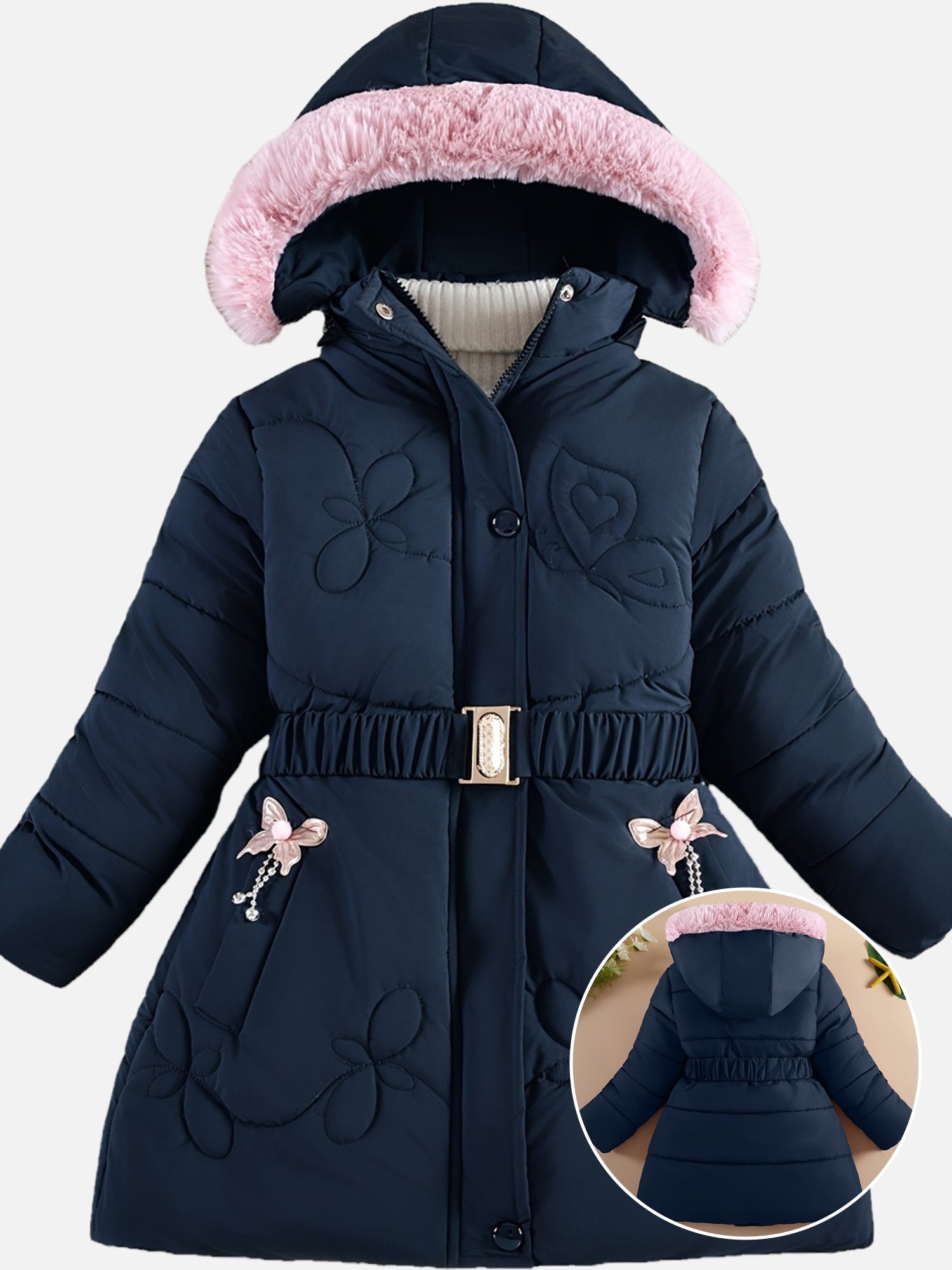 This dark navy blue girls' winter jacket combines warmth and style with durable polyester fabric and a cozy plush hood. Its detachable belt offers a customizable fit, while the subtle geometric floral design adds a refined touch. Designed for versatile wear, it ensures comfort and protection during colder months, making it an excellent choice for casual outings or everyday use.