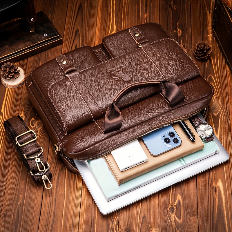 Elevate your professional style with this men's genuine leather business briefcase, designed for the modern working man. Crafted froemium brown leather with distinctive contrast stitching, it offers both durability and refined aesthetics. This 15" laptop messenger bag features multiple compartments to keep your essentials organized, including a padded section that securely fits your laptop. The adjustable shoulder strap ensures comfortable carrying whether you're commuting or traveling. Combining practicality with sophisticated design, this briefcase is ideal for business meetings, travel, and daily professional use. Experience seamless organization and timeless elegance with a bag built to last.