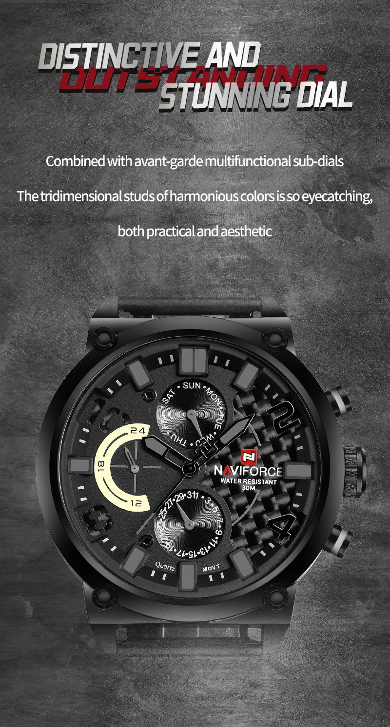 The NAVIFORCE Black Luxury Men Watch combines sophisticated engineering with bold military aesthetics, delivering a timepiece that seamlessly transitions from boardroom to adventure. Crafted for the modern man who demands both style and substance, this watch features robust waterproof construction capable of withstanding daily water exposure and aquatic activities. The precision movement ensures reliable timekeeping, while the striking black dial and masculine design make an authoritative statement on any wrist. Built with durable materials and meticulous attention to detail, this sports watch handles the demands of an active lifestyle without compromising on elegance. Whether you're navigating business meetings or outdoor pursuits, the NAVIFORCE delivers the perfect balance of tactical functionality and refined luxury. An investment in a timepiece that respects your time and reflects your character.