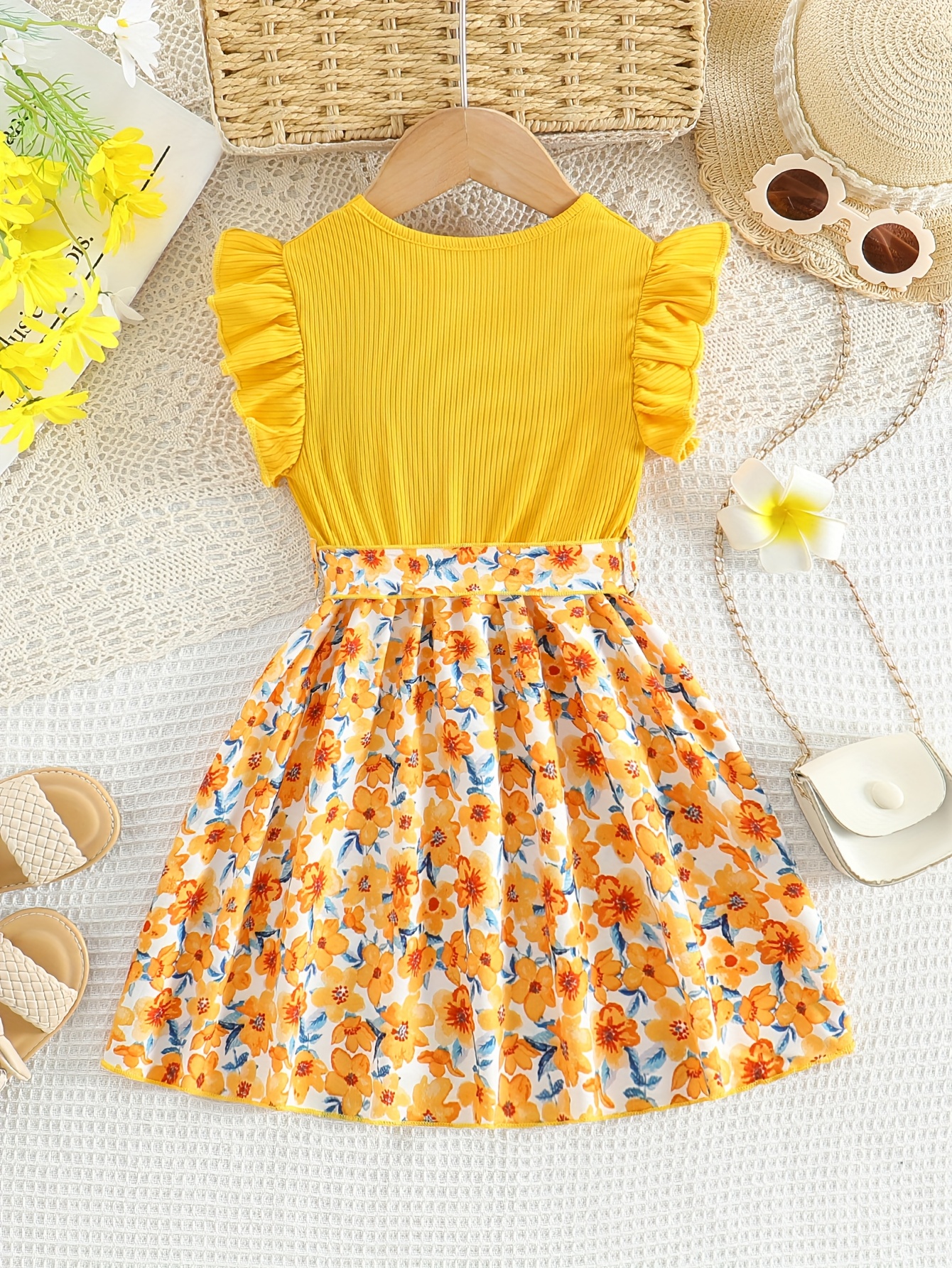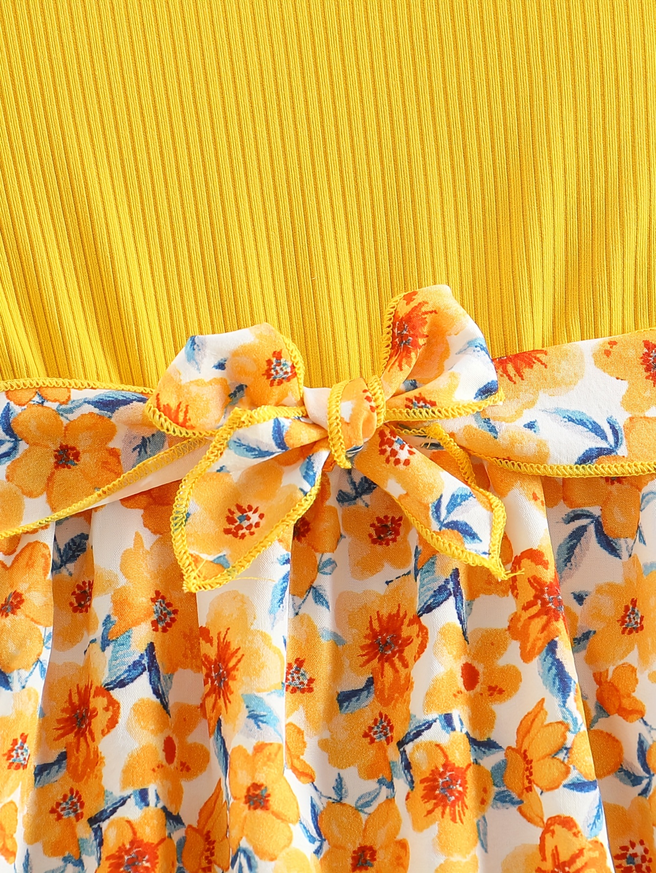 Girls' Patchwork Yellow Romantic Floral Print Dress