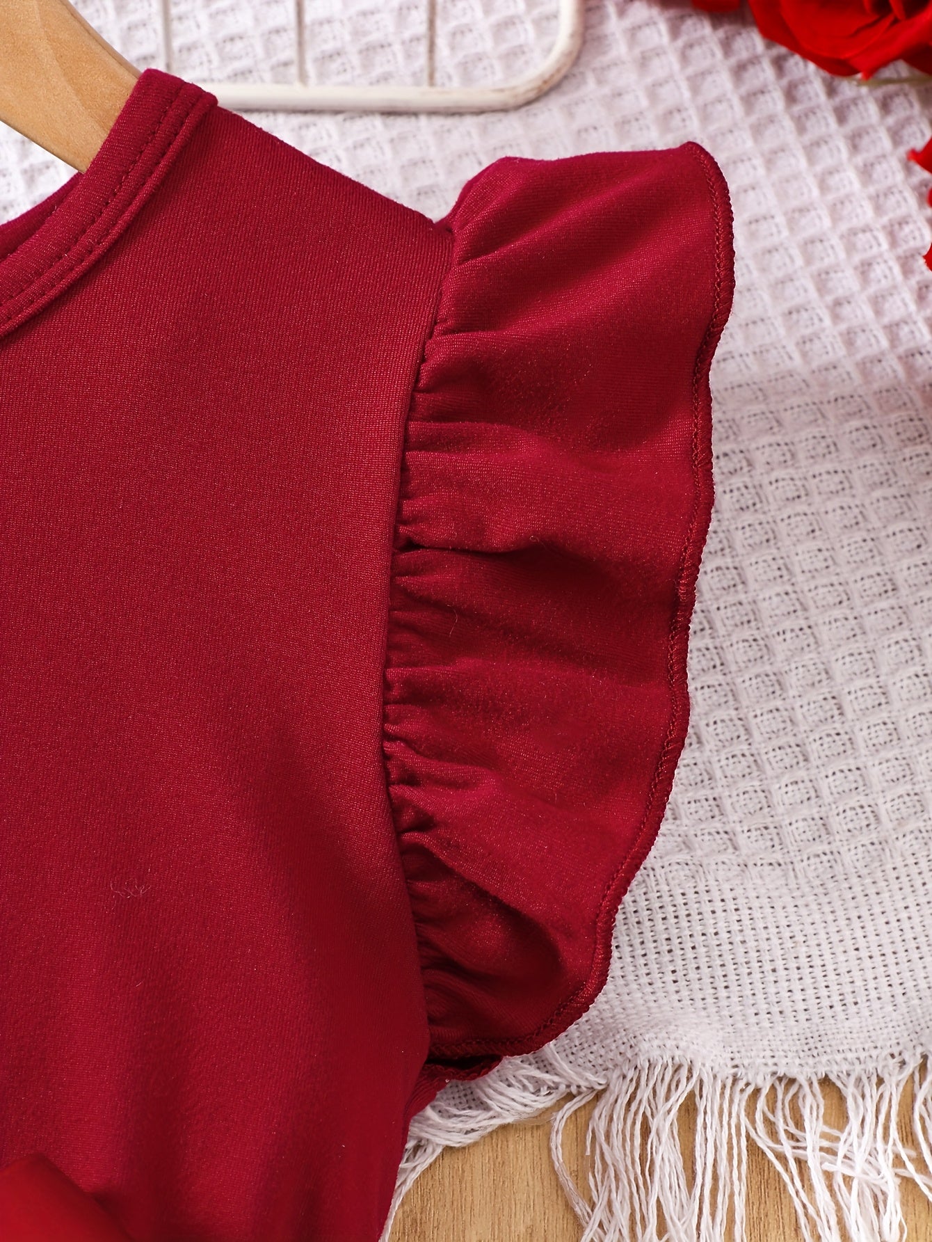 Burgundy Rose Print Flutter Sleeve Summer Girls' Casual Dress