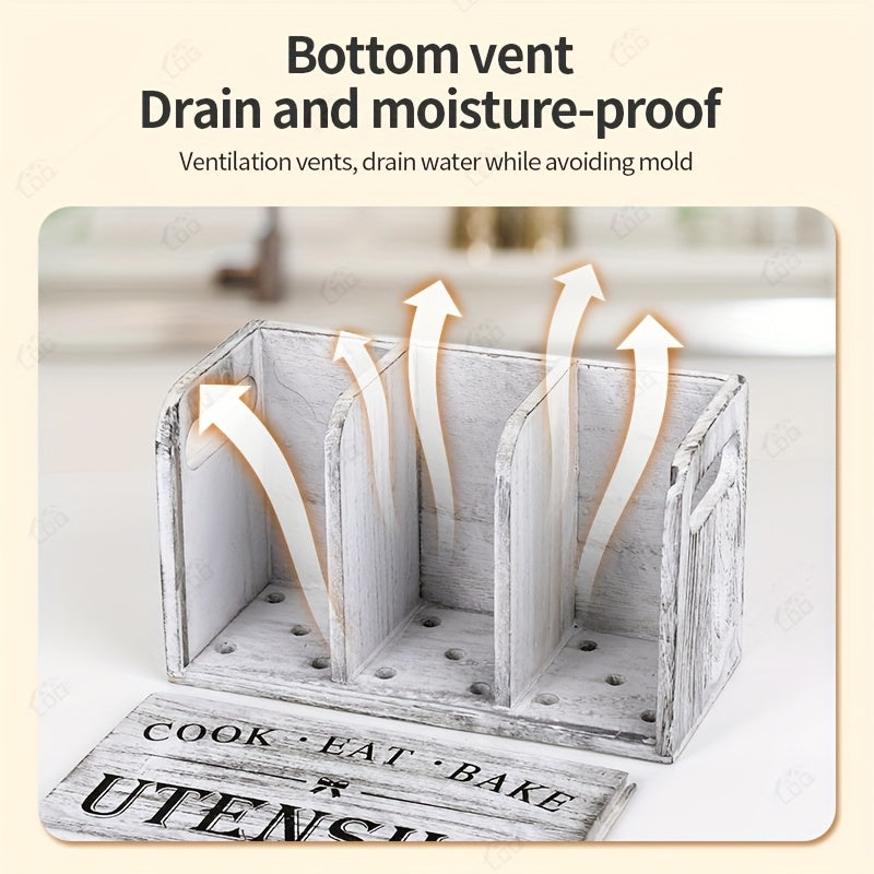 3-Compartment LDQ Rustic Wooden Kitchen Utensil Holder