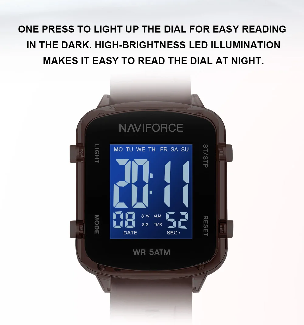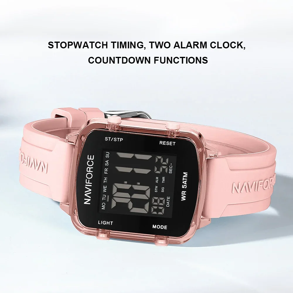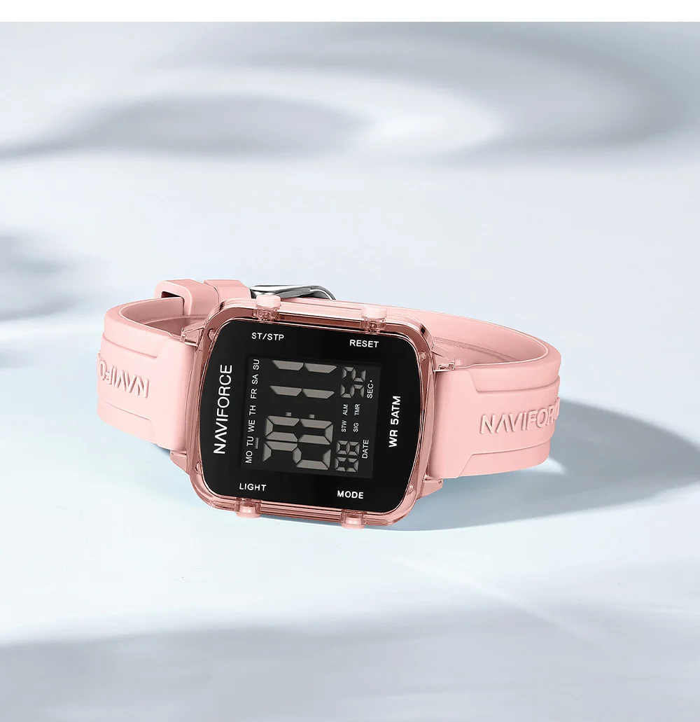 Discover the NAVIFORCE 2025 collection, engineered for the modern woman who demands both style and substance. These fashion-forward watches combine cutting-edge LCD digital movement technology with practical everyday functionality. Built to withstand your active lifestyle, each timepiece features robust 50-meter waterproof protection, making them ideal for water sports, swimming, and daily water exposure. The comfortable silicone band adapts to any wrist, offering durability without compromising on elegance. Whether you're navigating your professional schedule or weekend adventures, these ladies' watches deliver precision timekeeping with contemporary design. The digital display ensures easy readability in any lighting condition, while the lightweight construction makes all-day wear effortless. Experience reliability and sophistication in one sophisticated accessory that complements any wardrobe.