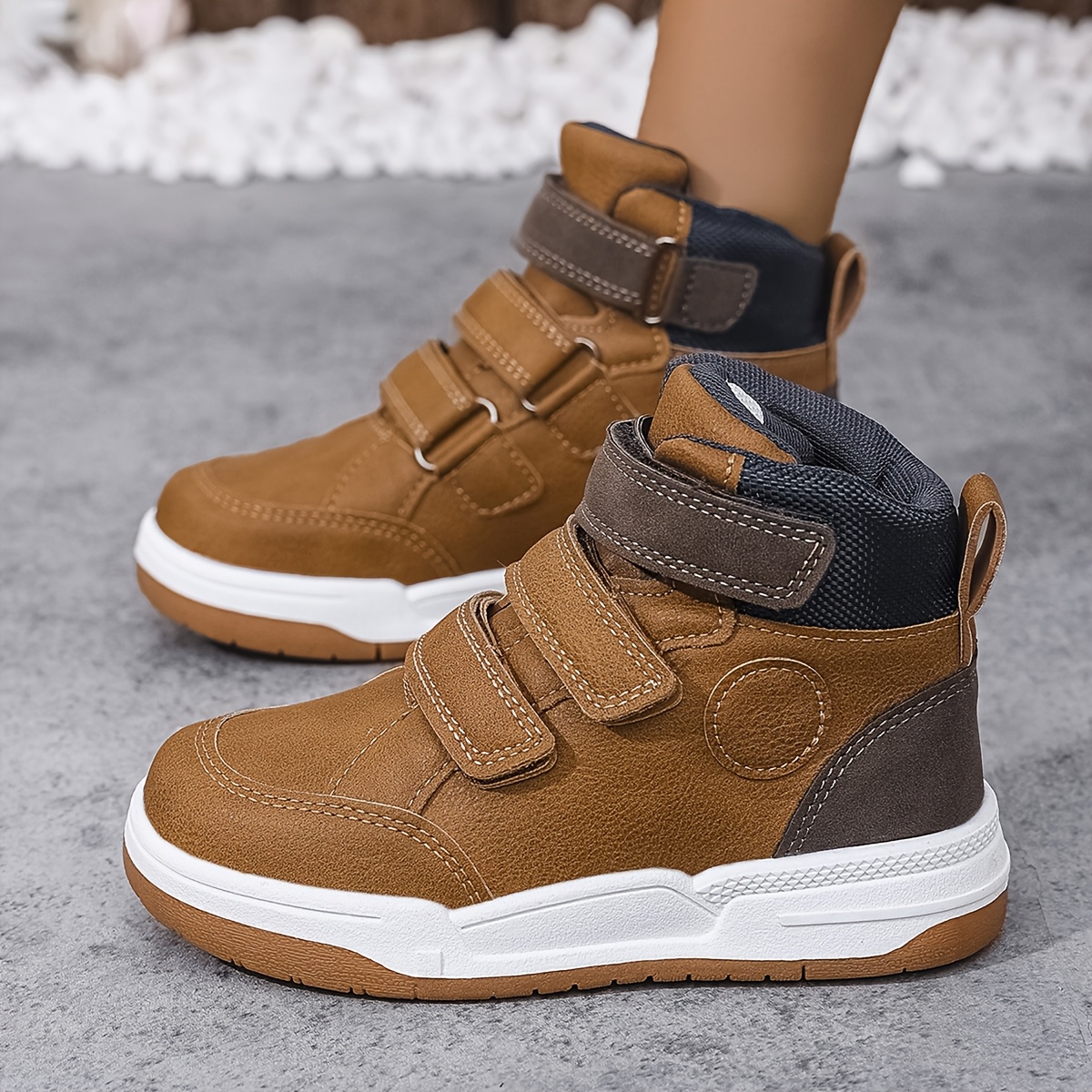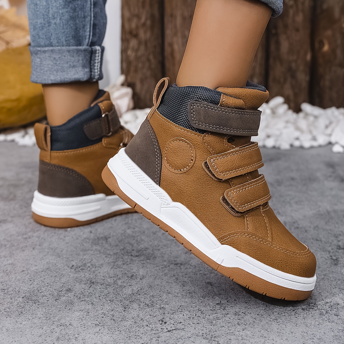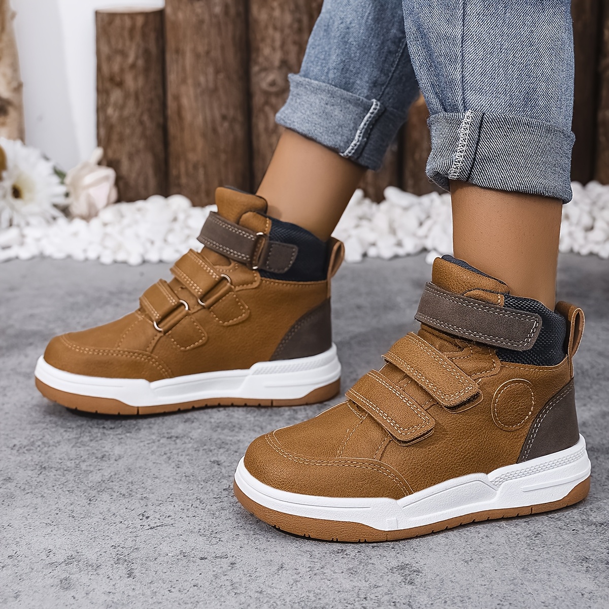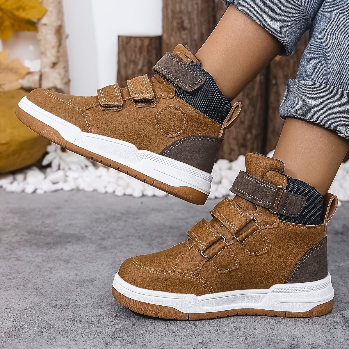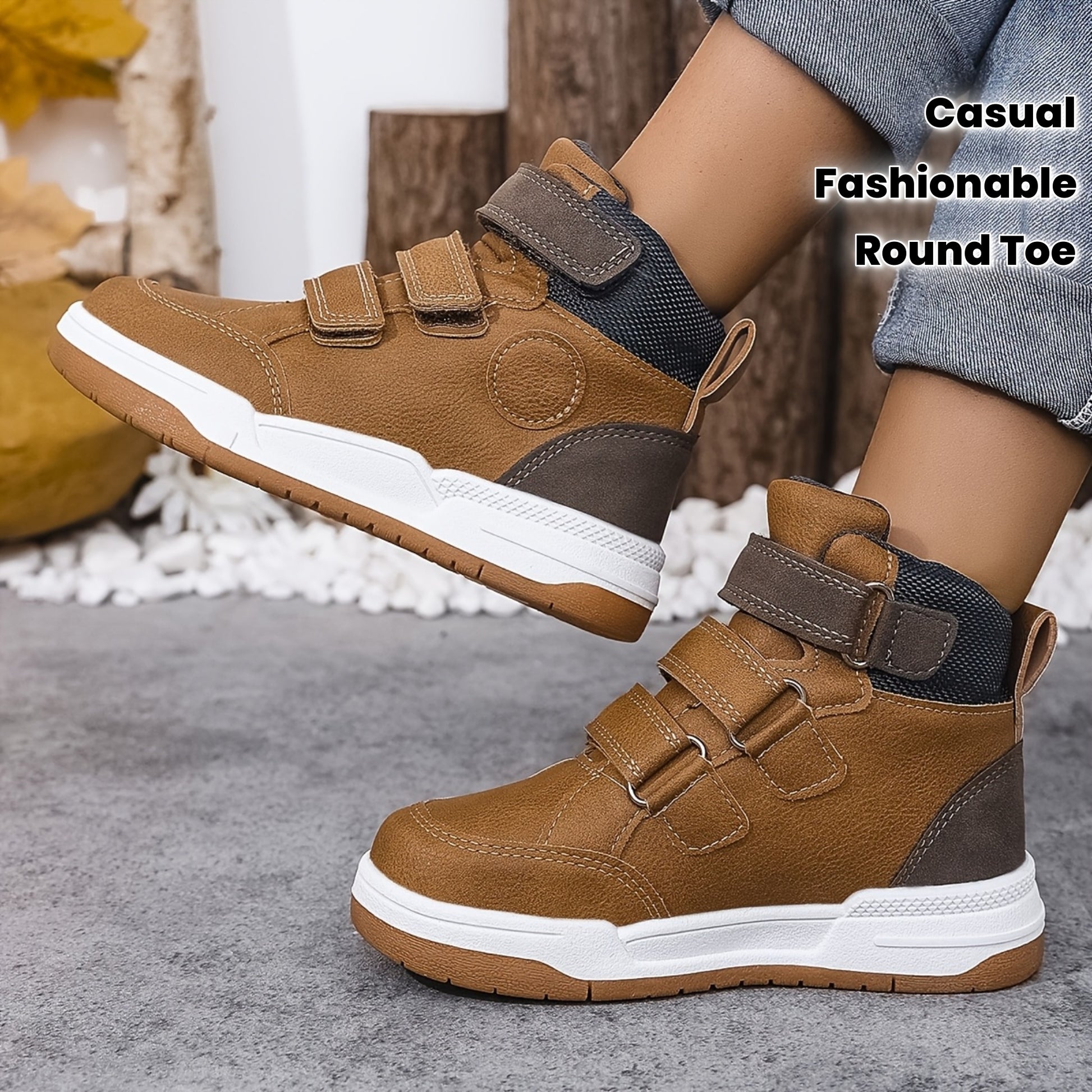 These youngsters' mid-top sneakers combine casual style with sporty functionality. Featuring a convenient hook-and-loop fastener strap closure, they ensure easy wear and secure fit. Crafted with a durable PU upper and breathable fabric lining, they provide comfort and lasting wear. The TPR sole offers reliable traction, while the round toe design allows natural movement. Available in brown or black with teal accents, these sneakers balance trendy looks with practical performance for everyday activities.